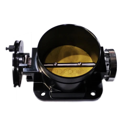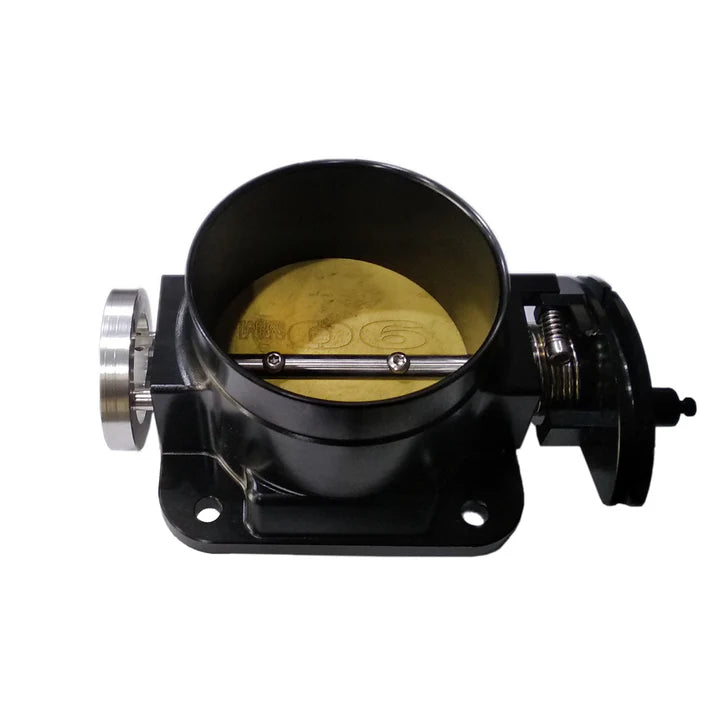 The BOOST 90mm throttle body is designed to support incredible power levels are cars that plan to still be street driven or want to retain throttle response in time attack or high powered drift cars. This throttle body is capable of supporting over 1000whp while still retaining great drivability. The 90mm throttle body is a direct fit for 3.5″ silicone hose. If you’re looking to make serious horsepower while still retaining throttle response and drivability, then this is the throttle body for you. Available in CW and CCW rotation to suit your TPS sensor regardless of engine model. Not sure if you need CW or CCW rotation throttle body, contact our team today for the best customer support in the industry and we’ll be sure to get you exactly what you need. BOOST throttle body project began in response to customers’ requests for a throttle body worthy of the quality and performance of their range of intake manifolds. BOOST aim was to provide the best possible combination of performance, appearance, reliability and ease of implementation. Take a look at the list of features and we are sure you will agree, BOOST has achieved that objective! CNC machined 6061T6 billet aluminum body section provides the best combination of strength, accuracy, light weight and appearance. Diameters have been chosen based on commonly available hose sizes and a large bead is provided to assure positive retention of the hose under boosted applications. Body section is clear anodized to further improve longevity and wear resistance (custom anodized colors available) 10mm diameter slotted steel shaft combined with 2mm thick brass butterfly provides high resistance to bending in supercharged / turbocharged applications. Shaft is blackened for corrosion resistance and improved appearance. Butterfly is machined in an elliptical shape with 7 degree taper to perfectly fit the throttle bore improving sealing and resistance to binding common with many other designs.